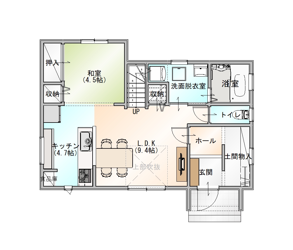 また、階段下のスペースを有効活用した間取りで、洗濯機置き場や収納として使えるのも便利。